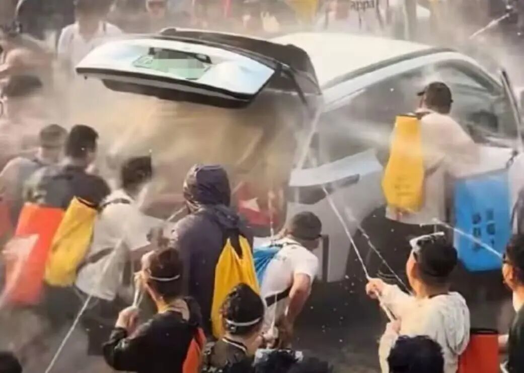 4月15日,汽车驾驶员妻子称,当时她坐在副驾,淋水后车内部冒烟。该女子表示,多人向内喷水时自己父母坐在车内,全身被淋湿。