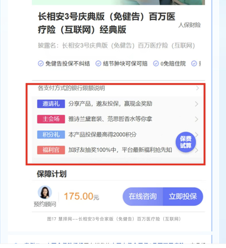 该《报告》所举典型案例为:慧择网平台销售的中华联合财产保险长相安3号合家版(免健告)百万医疗险(互联网),产品投保页面设置“主会场雅诗兰黛套装、范思哲香水等你拿”“投保最高得2000积分”“加好友抽奖100%中”等福利诱导内容,将保险产品与高价值非保险权益捆绑,诱导消费者冲动投保。