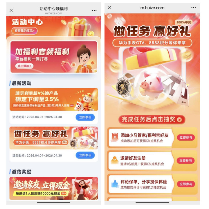 尽管《报告》发布已有近一个月,登录慧择保险网App后发现,平台内仍有“做任务,赢好礼”“邀请亲友,立得现金”等活动。其中,“做任务,赢好礼”活动显示,奖品包含华为手表、8888积分等,任务包括邀请好友注册、评论保单等4项,每完成一项任务即可获得一次抽奖机会,活动时间为4月1日至4月30日。