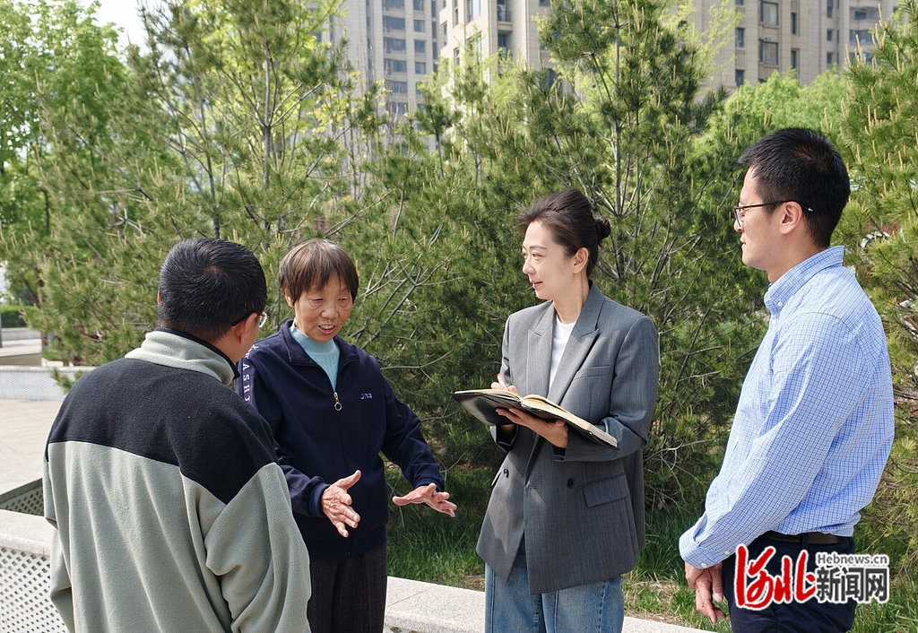 4月15日,在石家庄市体育大街与光华路交口的织锦园,张茜代表(右二)向市民征集完善口袋公园的意见建议。河北日报记者 刘冰洋摄