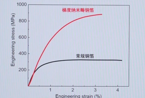 实验检测显示,“超级铜箔”的抗拉强度高达900兆帕,而普通工业铜箔的抗拉强度仅为300至600兆帕,新材料的强度约为常规铜箔的两倍。更令人惊叹的是,在强度大幅提升的同时,其导电率依然保持在高纯铜的90%,与同等强度的传统铜合金相比,导电能力提升了约两倍。此外,这种铜箔在普通环境下放置6个月,性能丝毫不会衰减,热稳定性极为出色。
