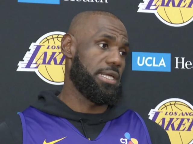 北京时间4月17日,在NBA季后赛首轮对阵火箭队赛前,湖人队球员詹姆斯接受了媒体的采访。