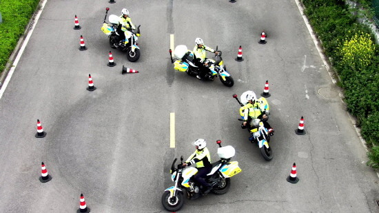4月14日,安徽省涡阳县公安局组织交警铁骑队员开展春季大练兵。图为铁骑队员进行绕桩练习。 吴胜利 摄