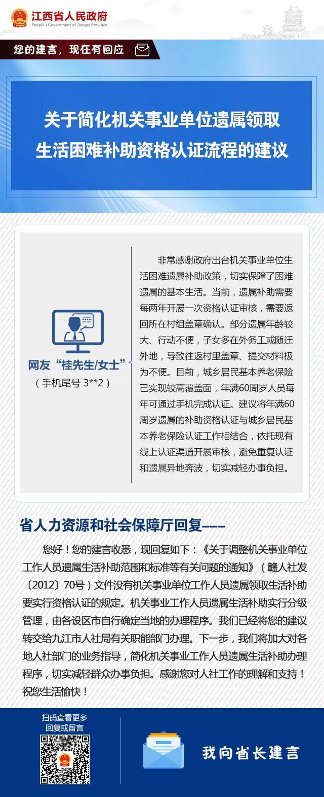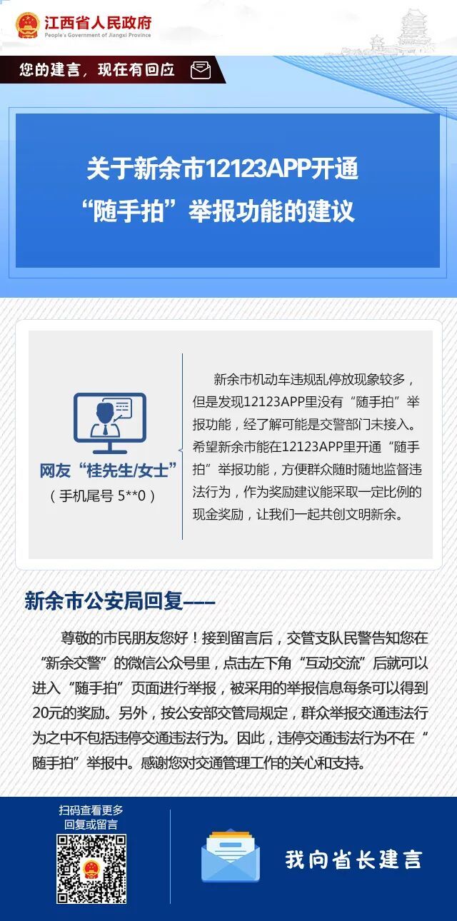 前期,省政府门户网站“我向省长建言”栏目和“江西省人民政府”微信公众号互动渠道收到众多网民留言,均及时予以回复,对部分有效建言转请有关部门处理并答复。