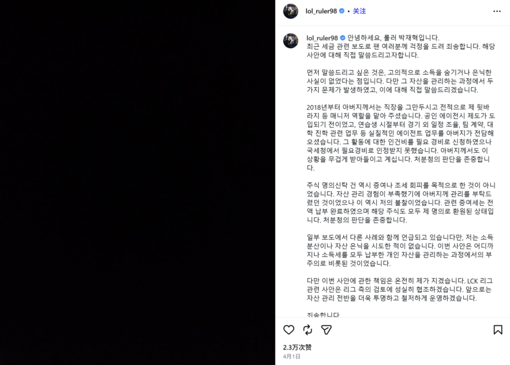 4月1日,Ruler在INS账号上发布道歉公告,口风基本维持经纪公司的说法,承认了个人财产管理上的疏忽,但没有故意逃税,正积极配合LCK联赛的调查。