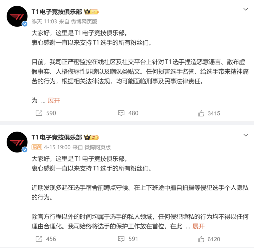 T1战队官方也连续两天发布声明,针对侵犯选手隐私、发布恶意谣言的行为进行严厉回应,T1其他选手、前选手的经纪公司也顺势开展反黑调查。