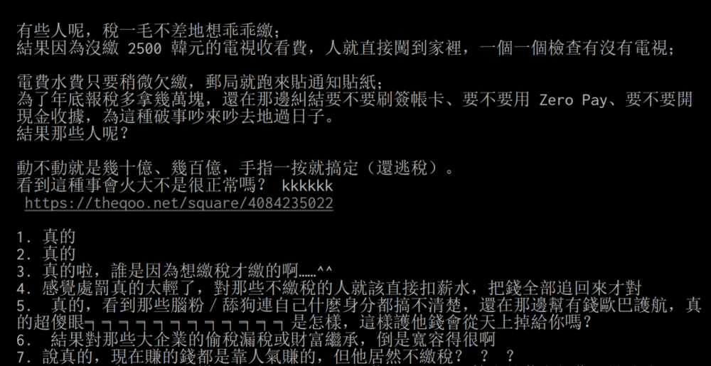 一方面,在韩国价值观中,纳税制度本身就受到重视,交税是基本义务也是社会契约,逃税不但是经济犯罪,也是道德破产。但更本质且好理解的一面是:韩国民众就是很痛恨名人逃税。