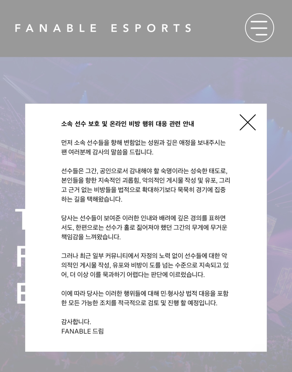 4月15日,知名选手Faker的经纪公司FANABLE发布公告称:“部分网络论坛针对选手们的恶意黑帖发布、传播及诽谤行为持续升级,已达无法坐视不管的程度。因此,我司现决定,将积极研讨并推进包括民事、刑事法律手段在内的一切可行措施。”——用词颇为严厉。