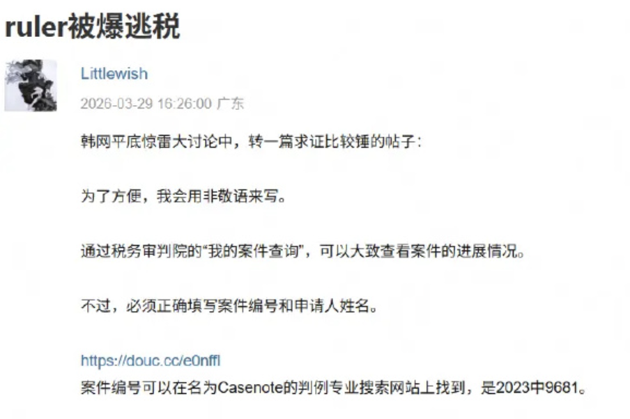 2023年5月,韩国国税厅对Ruler的个人财务问题展开调查,基于以上两点,要求他追缴税款。对此Ruler方面表示不服,选择上诉。
