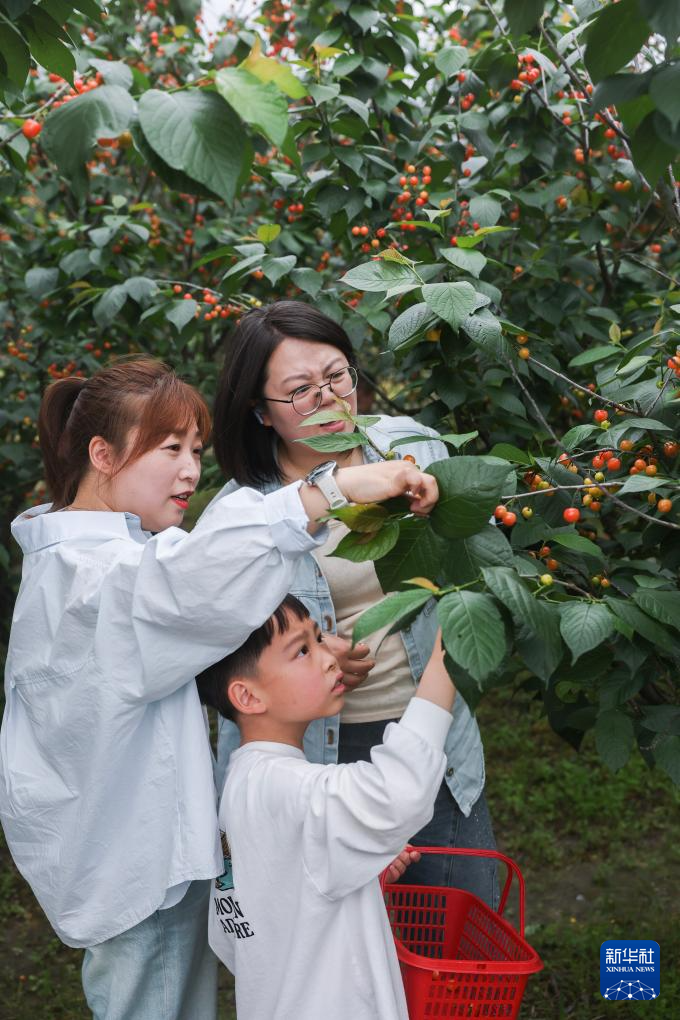 4月18日,游客在赵家镇的樱桃园里采摘首批成熟的樱桃。