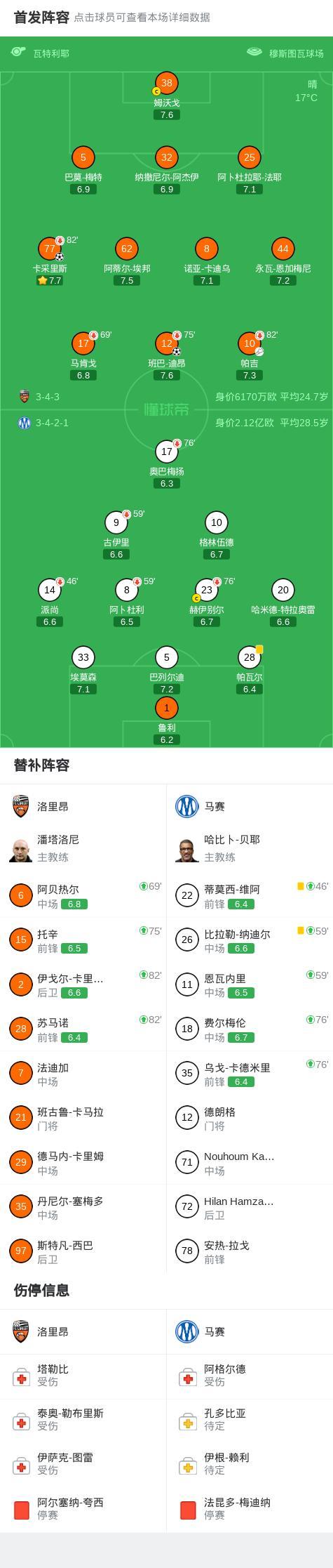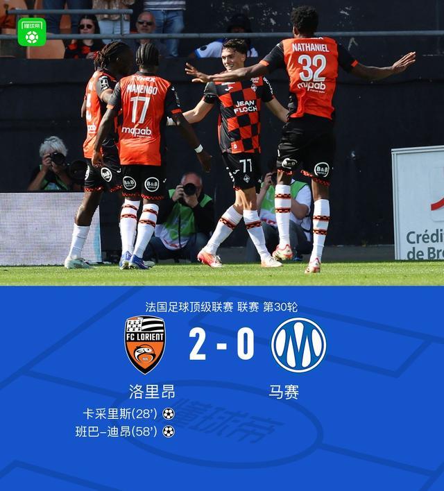 北京时间4月18日23:00,法甲第30轮,洛里昂主场对阵马赛。上半场,格林伍德禁区内抽射被门将没收,卡采里斯打破僵局。下半场,奥巴梅扬头球攻门顶偏,班巴-迪昂挑射攻破旧主球门,最终,洛里昂2-0马赛。