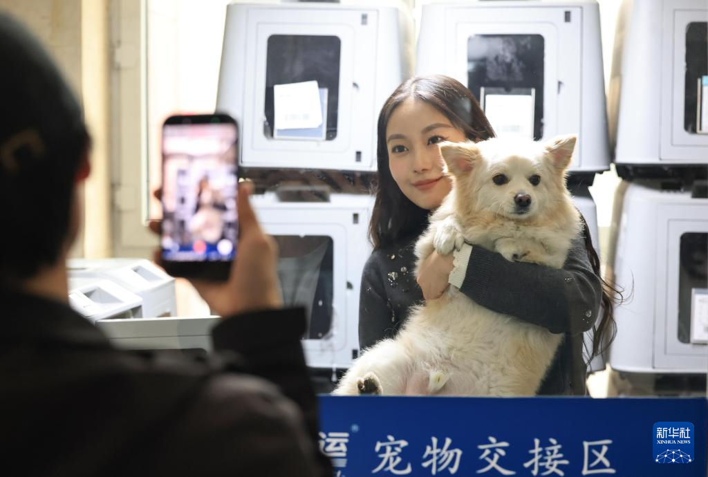 4月19日,旅客在中铁快运哈尔滨西站营业部与即将进入“智能座舱”运输箱内的宠物狗合影。