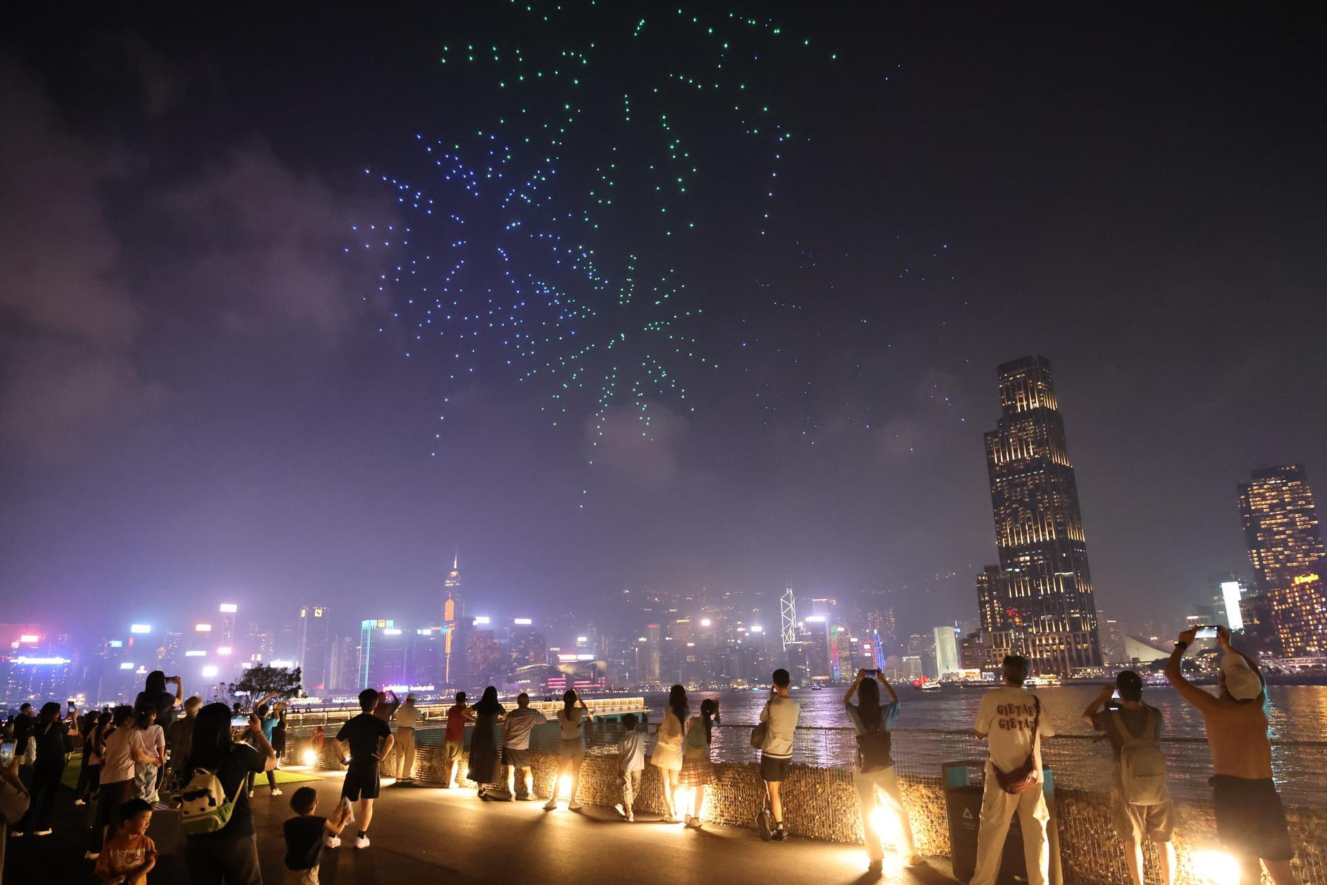 市民在红磡新海滨欣赏表演,无人机呈现璀璨烟花图案。(本刊记者 杨一涵 摄)