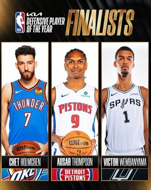 北京时间4月20日,NBA官方公布了本赛季最佳防守球员的最终三名候选人,雷霆队的切特、活塞队的奥萨尔-汤普森和马刺队的文班亚马成功入选。