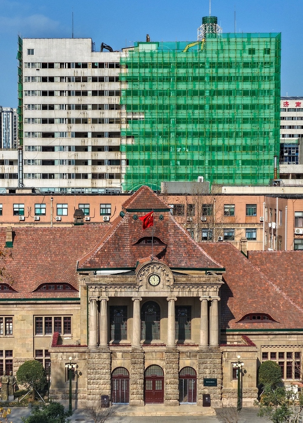 △2026年4月14日,天龙大厦拆除“让路”,两代济南火车站百年“同框”。从约40米高的空中眺望,济南火车站整个站房与拥有百年历史的胶济铁路老火车站实现了跨越百年的“同框”。一座是现代交通枢纽的繁忙站房,一座是见证中国铁路发展史的百年老建筑,两座不同时代的车站如今在视线中交汇,成为泉城城市更新进程中一道独特的风景线。