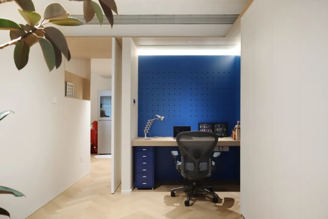 男屋主心心念的蓝色,不方便在公共区域里大面积应用,但在次卧里就有了施展空间。这个以蓝色为主题的沉浸式办公、学习空间,满足了他长久以来的愿望。