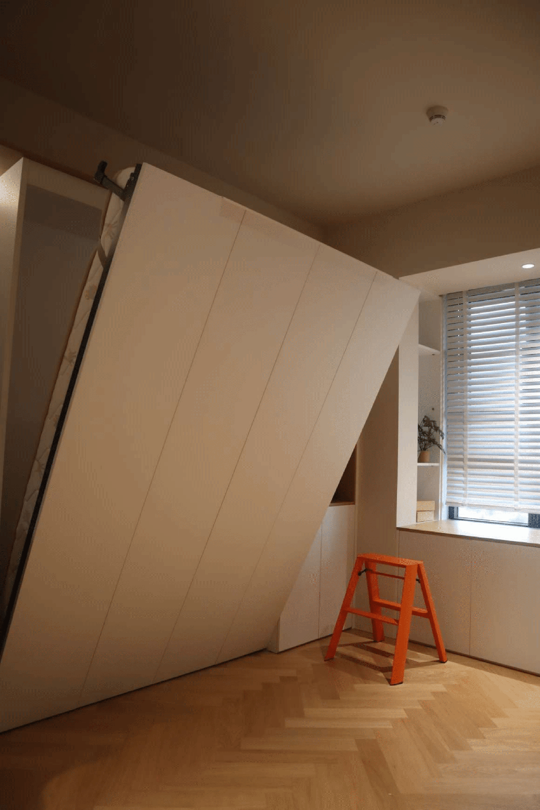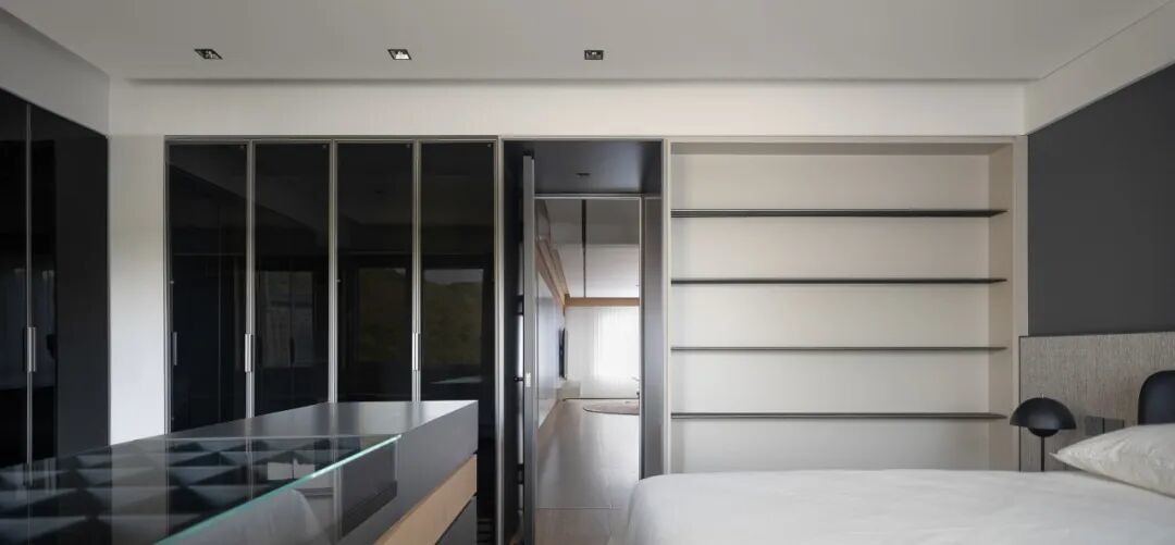 他们通过口袋门的隔断,实现了不同模式的弹性切换。当儿子不在家时,是主卧+书房的私密空间。儿子回来后,可以直接转变为次卧+书房的模式。