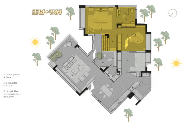 成都的屋主阿福和老公住在145㎡的三居室里。除了每天居住的主卧,两个次卧对于他俩来讲略显多余,尤其是西晒的鸡肋小次卧。