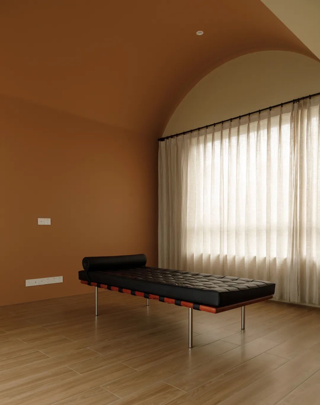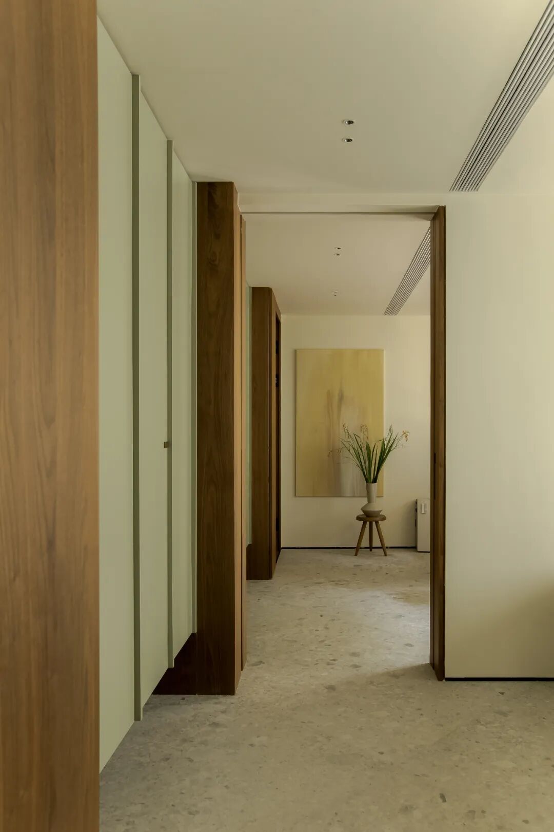 设计师选择把这间次卧打开,作为专门的客厅使用。在下午充足阳光的映衬下,胡桃木墙板和松灰色的微水泥更显温润质朴。