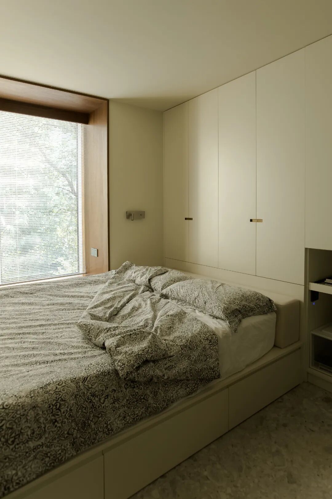 原本只放一张床的次卧,如今可以满足观影、收纳、用餐、办公等多种功能。窗边定制了榻榻米床,内部用来储物,也能满足偶尔待客。