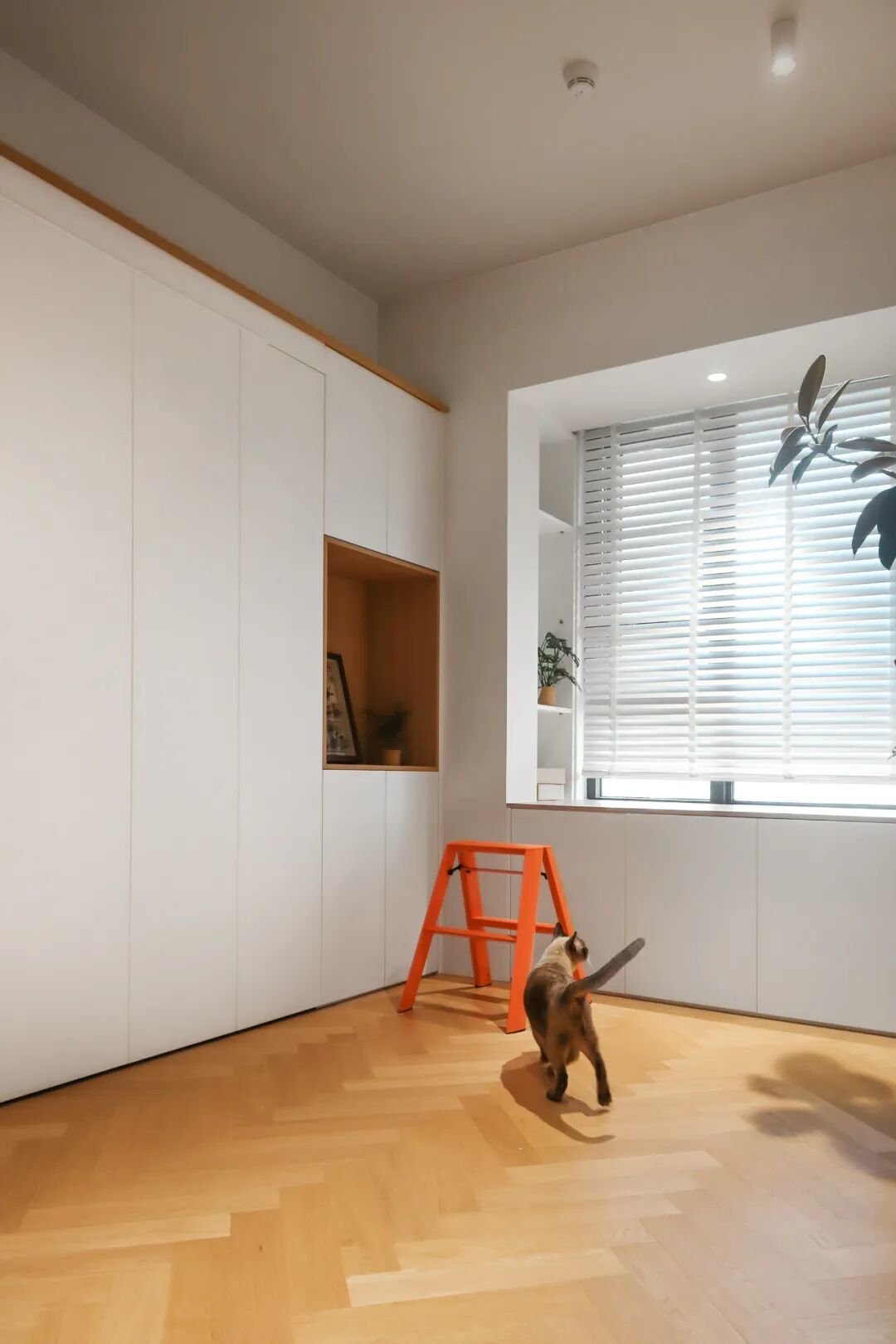 如果实在没想好次卧如何布置,索性可以把这里“留白”。这对常州小夫妻,把暂时闲置的儿童房作为健身房和养猫房,还预留了上下水和淋浴,用来健身之后喝水、冲澡,或给猫咪洗澡美容。