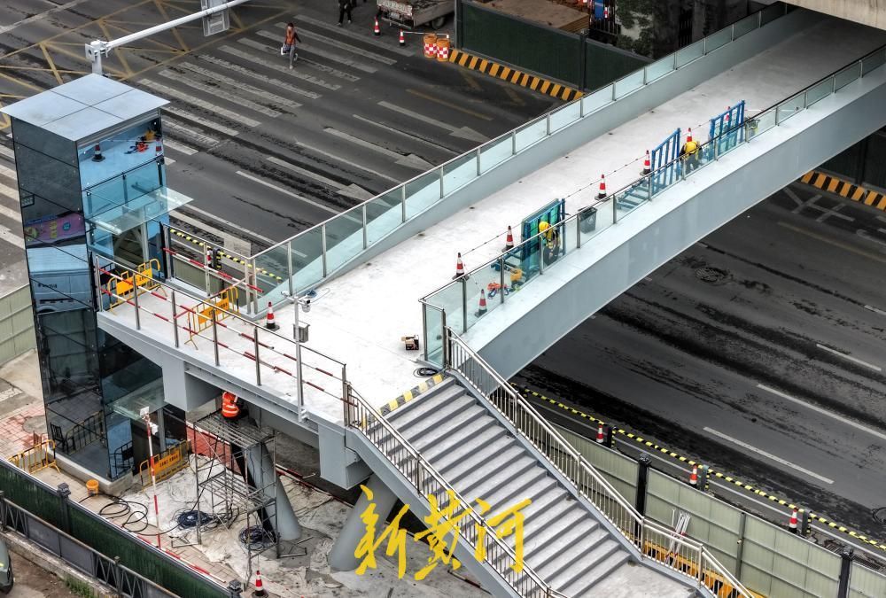 桥体全长62.3米,桥面宽6米,采用“H”形造型,象征坚韧与活力;桥面护栏为波浪形,兼具安全性与美观性;东西两侧同步配备直梯+人行梯道,实现无障碍通行。