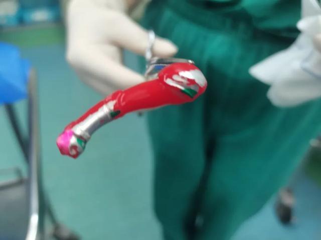 该患儿因外阴出现脓性分泌物、阴道内异物滞留而入院,石门县人民医院妇科团队检查后发现异物,随即在全麻下通过微创手术,顺利从患儿阴道内取出一截奥特曼玩具腿部零件。