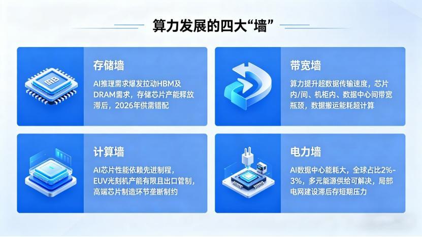 AI Infra产业链正面临着多维瓶颈的交织制约。从算力层面的存储墙、带宽墙、计算墙、电力墙,到扩产层面的测试设备、IC载板、特种材料、洁净室紧缺,再到连接层面的技术路线之争,每一个环节都在影响着AI算力的规模化部署。