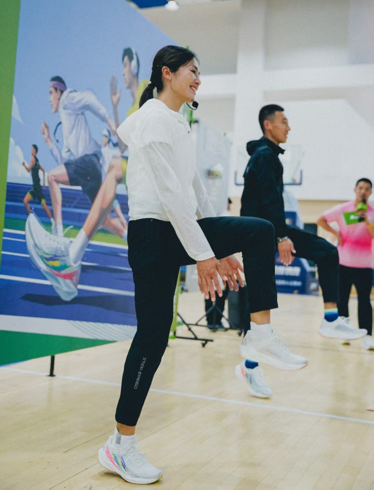 随后,黄菲与房博现场示范带练,与同学们互动交流,带大家拆解了800米/1000米跑的呼吸节奏、标准跑姿、跑前热身与跑后拉伸及运动损伤预防等实用技巧。