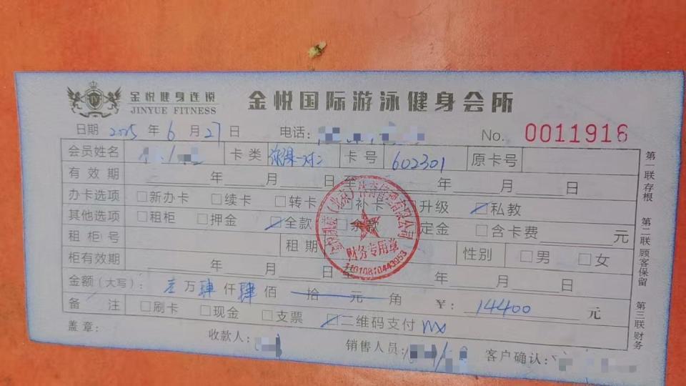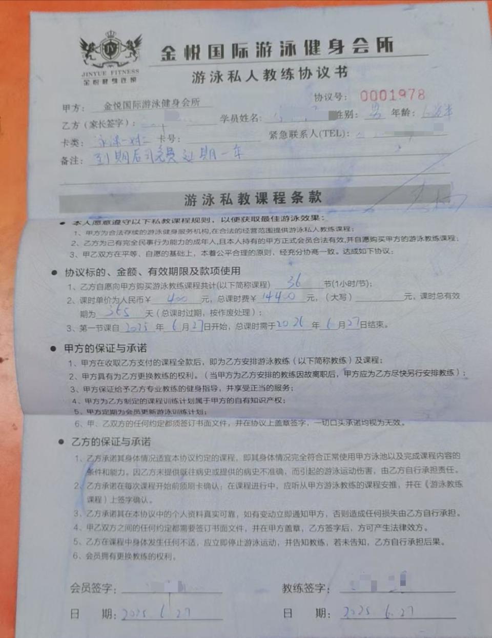 在杨先生提供的金悦国际游泳健身会所游泳私人教练协议书上,华商报大风新闻记者看到,总课时费14400元,后来升单两次,转账至教练微信,共计6020元。