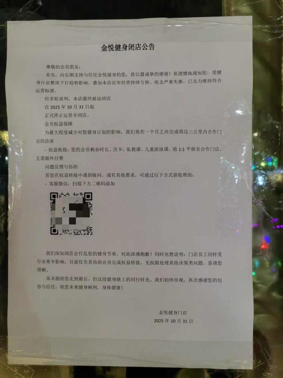 2025年10月31日,金悦健身门店在健身房玻璃门上张贴的闭店公告显示,受健身行业整体下行趋势影响,叠加该店近年经营持续亏损、收支严重失衡,已无力维持符合运营标准,自2025年10月31日起正式停止运营并闭店。将在一个月之内完成周边三公里内合作门店的洽谈,会员剩余时长、次卡、私教课、儿童游泳课,将1:1平移至合作门店,无需额外付费。