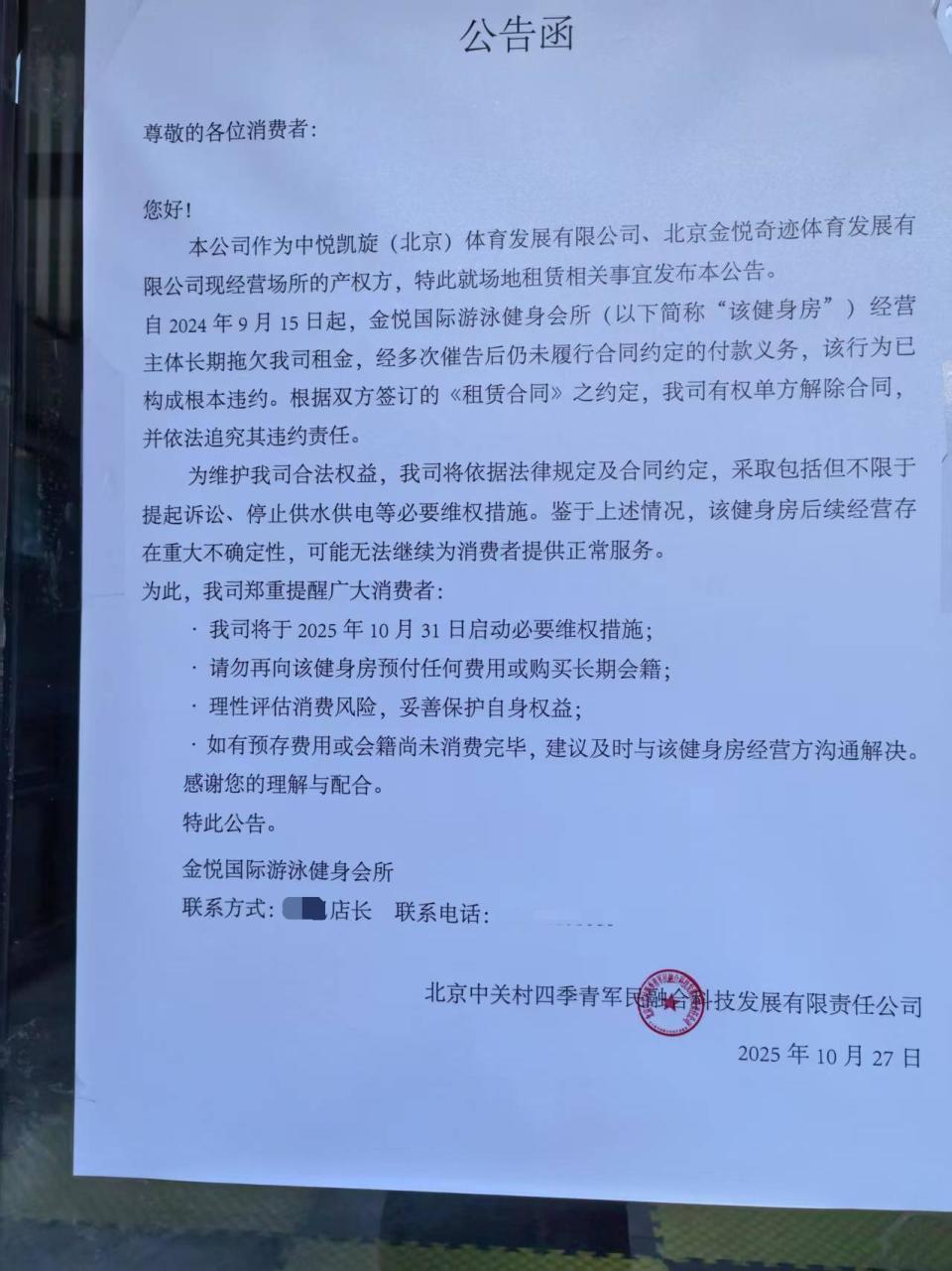 杨先生提供的公告函显示,2025年10月27日,金悦国际游泳健身会所经营场所的产权方提醒,自2024年9月15日起,该健身房经营主体长期拖欠租金,后续经营存在重大不确定性,可能无法继续为消费者提供正常服务,请勿再向该健身房预付任何费用或购买长期会籍,如有预存费用或会籍尚未消费完毕,建议及时与该健身房经营方沟通解决。
