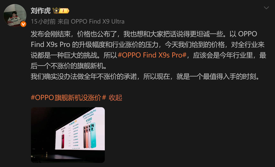 OPPO首席产品官刘作虎直言,考虑到Find X9s Pro的升级幅度以及行业整体涨价压力,这样的定价对整个行业来说都是一次不小的冲击。他甚至表示,这款产品很可能会成为今年业内“最后一款不涨价的旗舰机”。