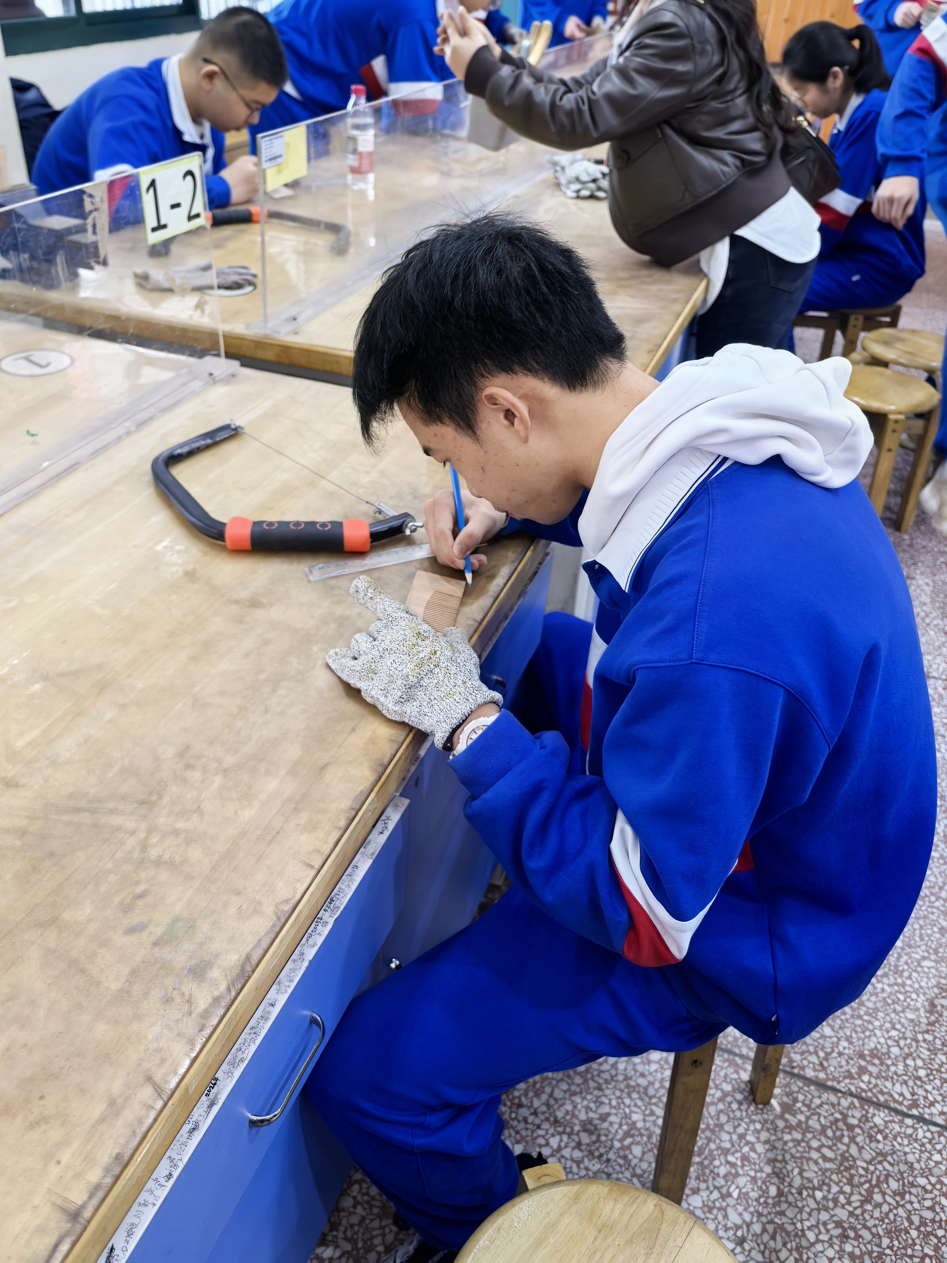 看似简单的木梳制作,实则考验着同学们的耐心与细心。起初,不少同学手握锉刀时略显生疏,要么力度把控不当导致坯料边缘参差不齐,要么打磨不到位留下粗糙痕迹,但大家反复尝试、专注打磨。有的同学认真勾勒雕花图案,一笔一划尽显认真;还有的同学相互分享打磨技巧,在协作交流中共同进步。