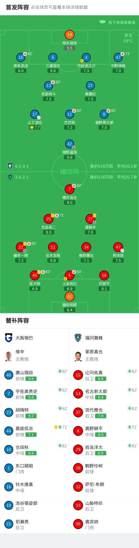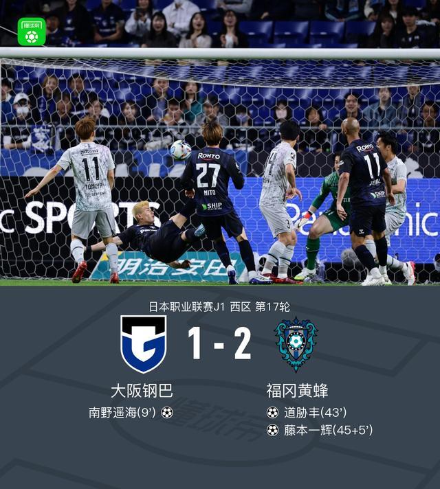 北京时间4月22日日本职业联赛J1西区第17轮,大阪钢巴主场对阵福冈黄蜂。大阪钢巴南野遥海破门。福冈黄蜂道胁丰、藤本一辉破门。最终比分大阪钢巴1-2福冈黄蜂。