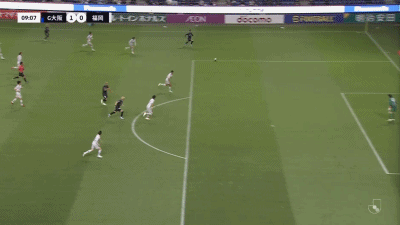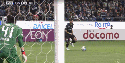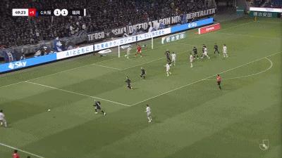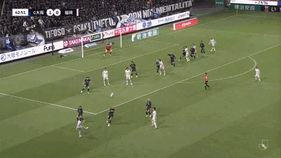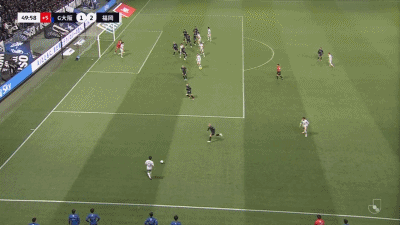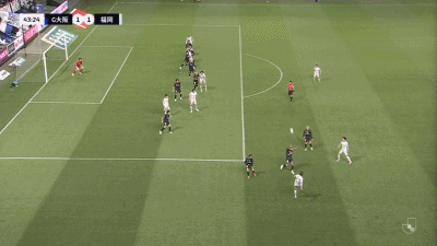 第45+5分钟,反超比分,藤本一辉头球吊射得分,福冈黄蜂2-1