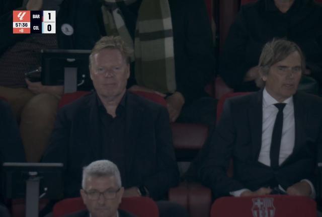 本场比赛巴萨坐镇诺坎普迎战塞尔塔,在比赛因看台球迷突发医疗状况而暂停期间,转播镜头找到了看台上的罗纳德-科曼和科库。