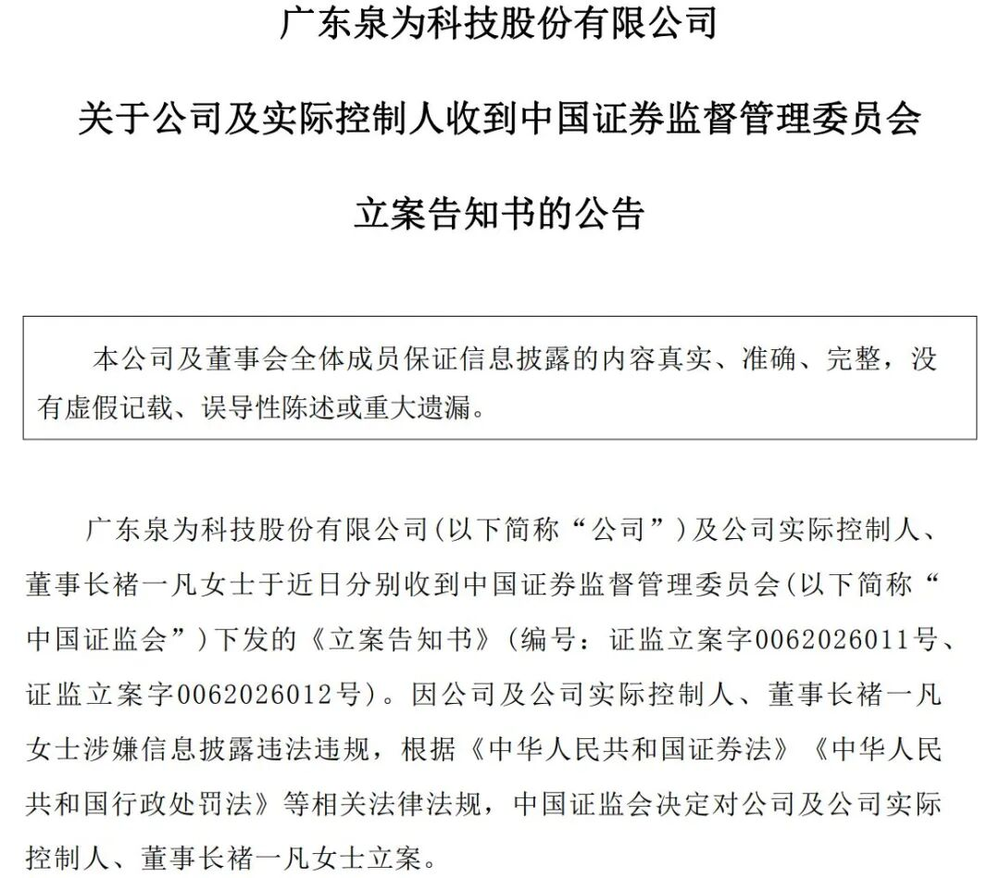 2025年7月,山东泉为以厂房抵押向枣庄银行借款的1亿元到期,剩余7990万元逾期,被银行提起诉讼。同年12月,安徽泉为名下位于泗县的厂房、员工宿舍、展示中心被法院评估、拍卖。今年3月,泉为科技2GW异质结产线设备被法院查封;同月,泉为科技及褚一凡被证监会立案调查。