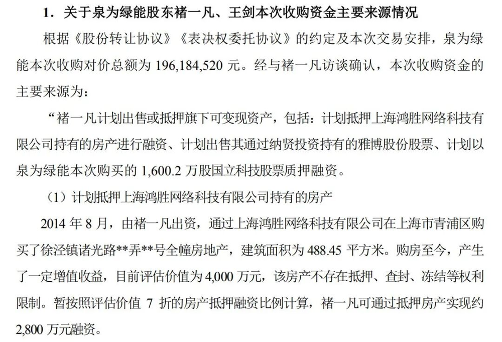 第三重误判是对资本的误判——泉为科技自有资金不足,依赖借贷维持。2022年末褚一凡耗资1.96亿元收购国立科技,据当时泉为科技披露,其收购资金需依靠质押所购股票融资和抵押房产而来。