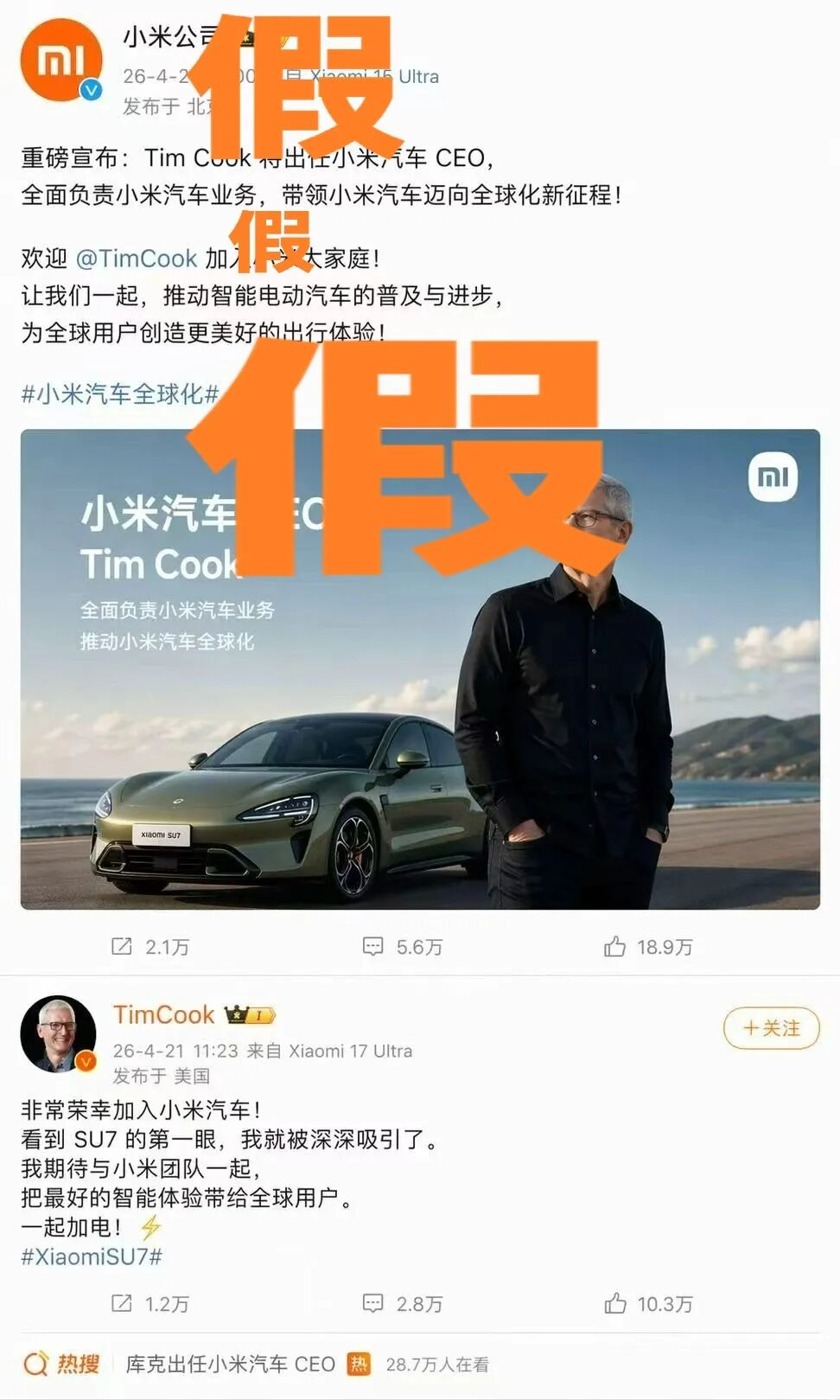 小米公司微博宣布 Tim Cook 出任小米汽车 CEO,Tim Cook 本人微博账号跟进回应“一起加电”,配了海边 SU7 的广告大片,热搜 28.7 万人在看。