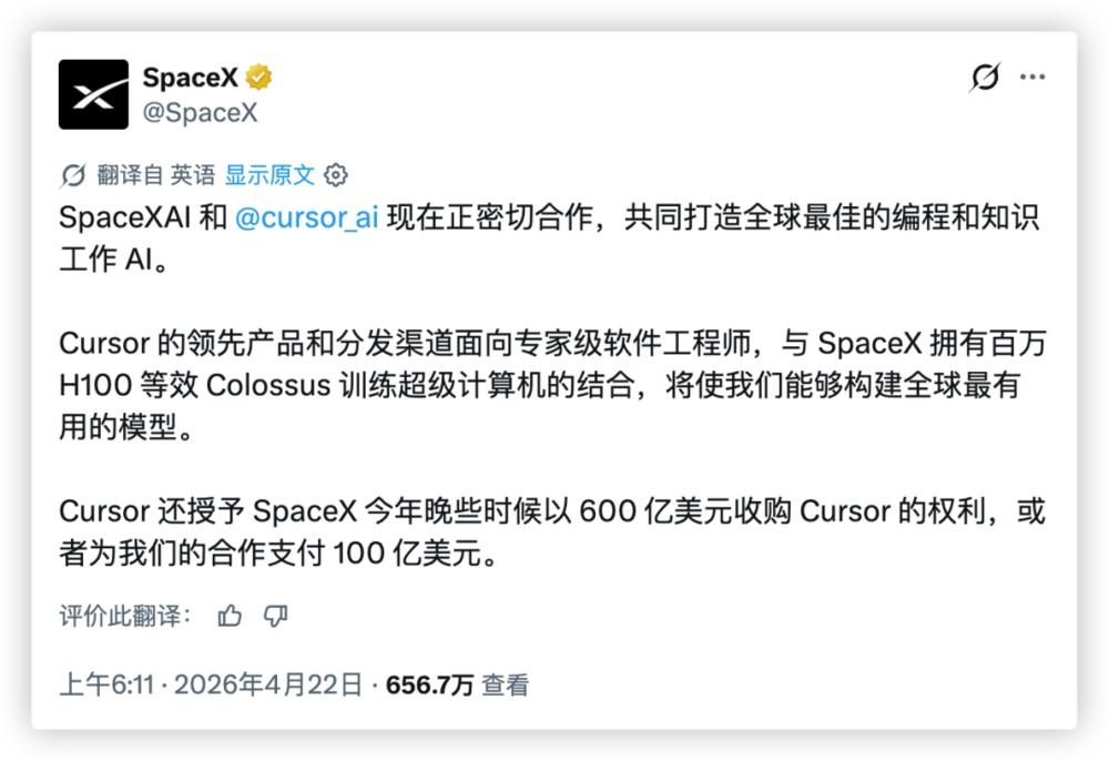 SpaceX 官方账号发推宣布与 Cursor 合作,称 Cursor 授予 SpaceX 以 600 亿美元收购 Cursor 的权利,浏览量 656.7 万。