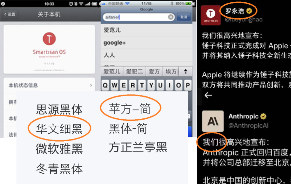 让我们回到上文的图片区域,找到“罗永浩推文”和其它 X 推文截图对比。实际上,“罗永浩推文”使用了锤子手机默认的华文黑体作为字体;在另一张 X 推文中,使用的却是苹方。