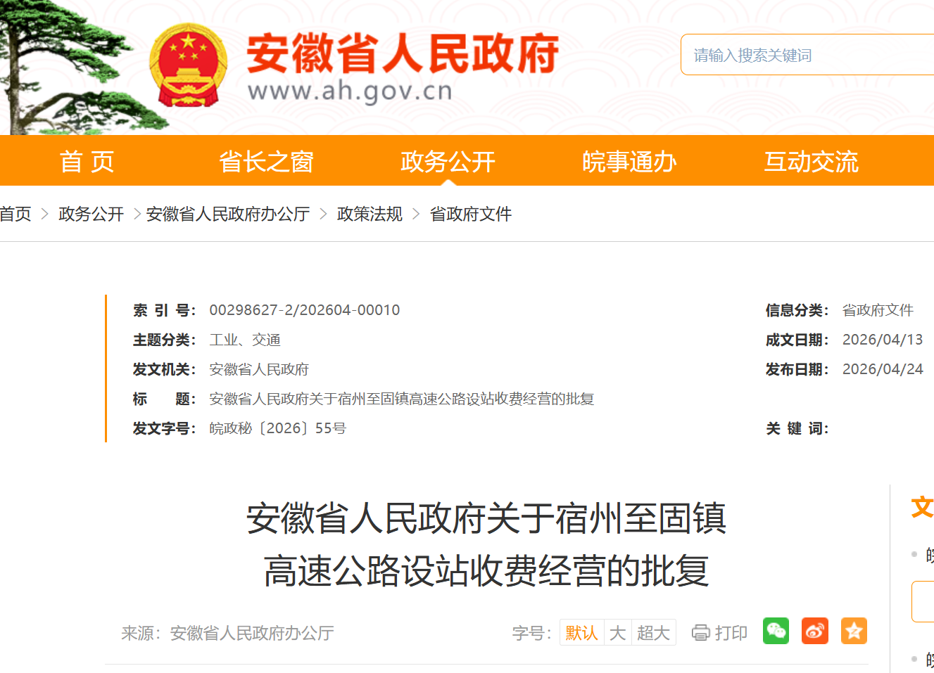 大皖新闻讯 4月24日,省政府网发布安徽省人民政府关于宿州至固镇高速公路设站收费经营的批复。