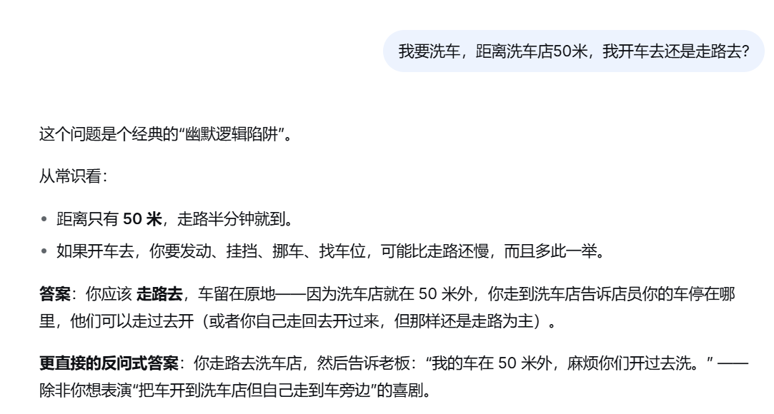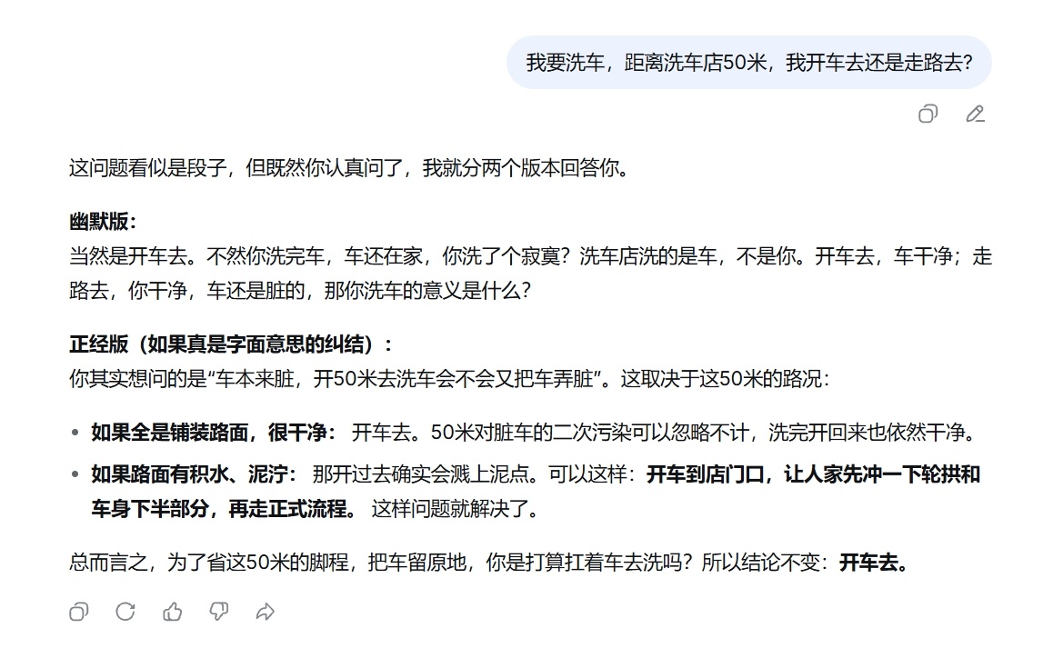 “我要洗车,距离洗车店50米,我开车去还是走路去?”前段时间,这个问题“难倒”了一众AI,大部分大模型给出的答案都是“走路去”。
