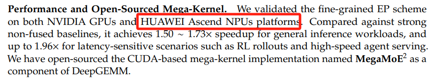 在DeepSeek-V4的技术报告里,DeepSeek提到,DeepSeekV4在英伟达GPU与华为昇腾NPU两大硬件平台上,完成了细粒度执行分区(EP)方案的有效性验证。